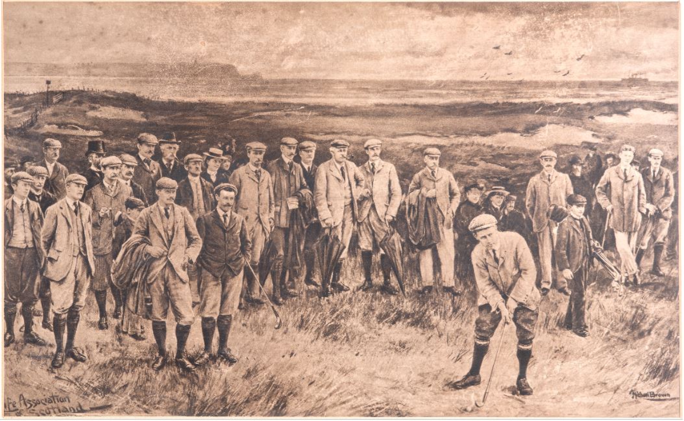 Michael Brown painted many golfing scenes and as commissioned by “The Life Association of Scotland,” insurance company, for their annual calendar. On this painting he shows the players in the first ever international match.